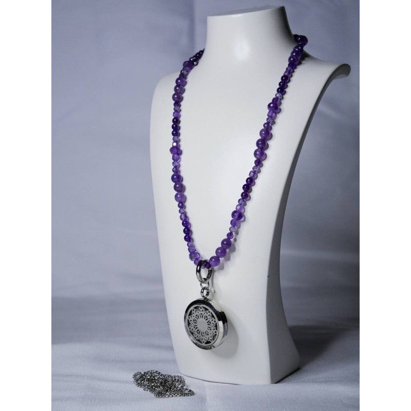 Właściwości ametystu w połączeniu z olejkami eterycznymi np: bergamotka, pomarańcza, cytryna, szałwia muszkatołowa, geranium, geranium rose, drzewko różane, trawa cytrynowa mogą przynieść ulgę w stanach emocjonalnych, wyciszając autostradę myśli, wspierając jasność umysłu.