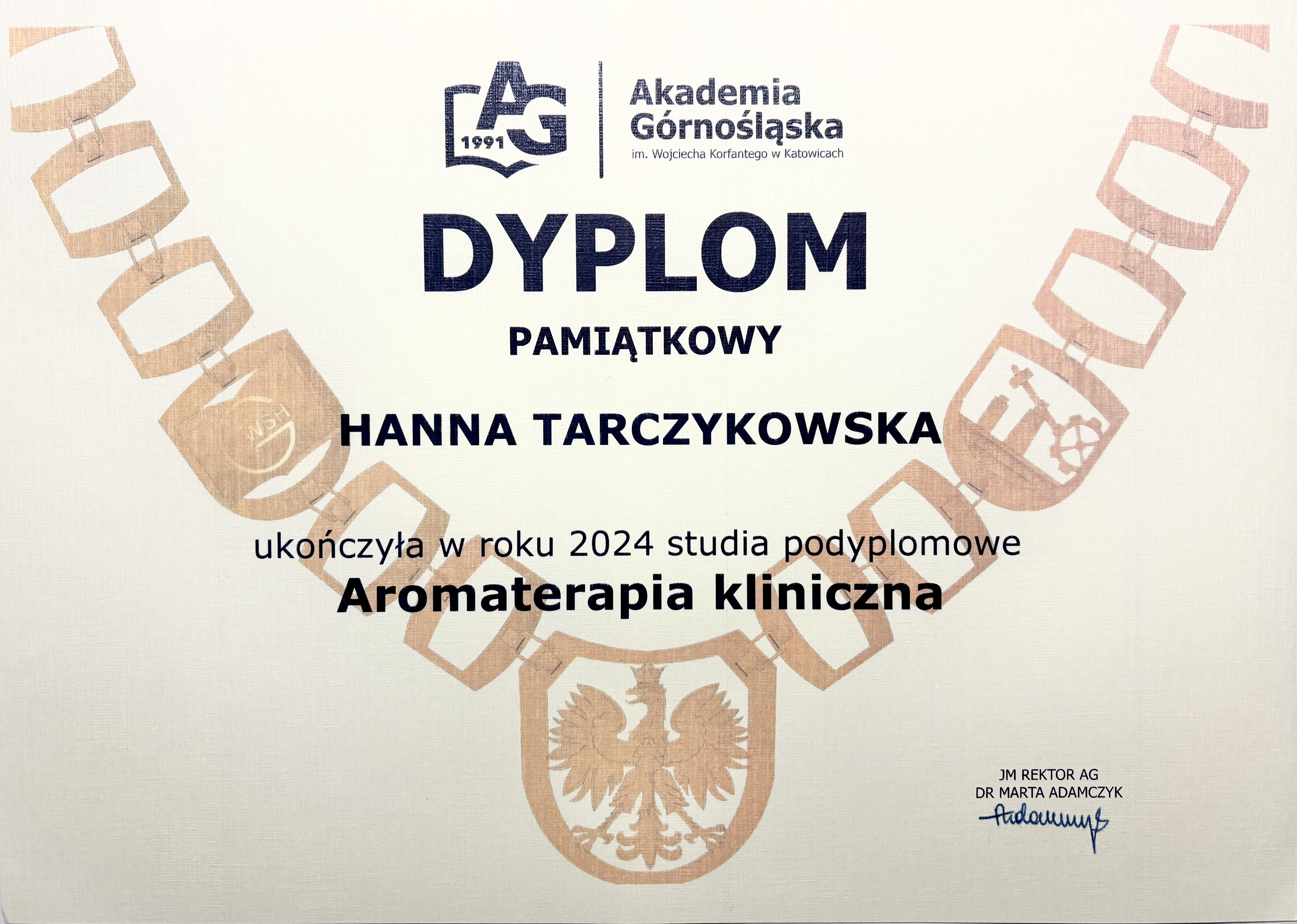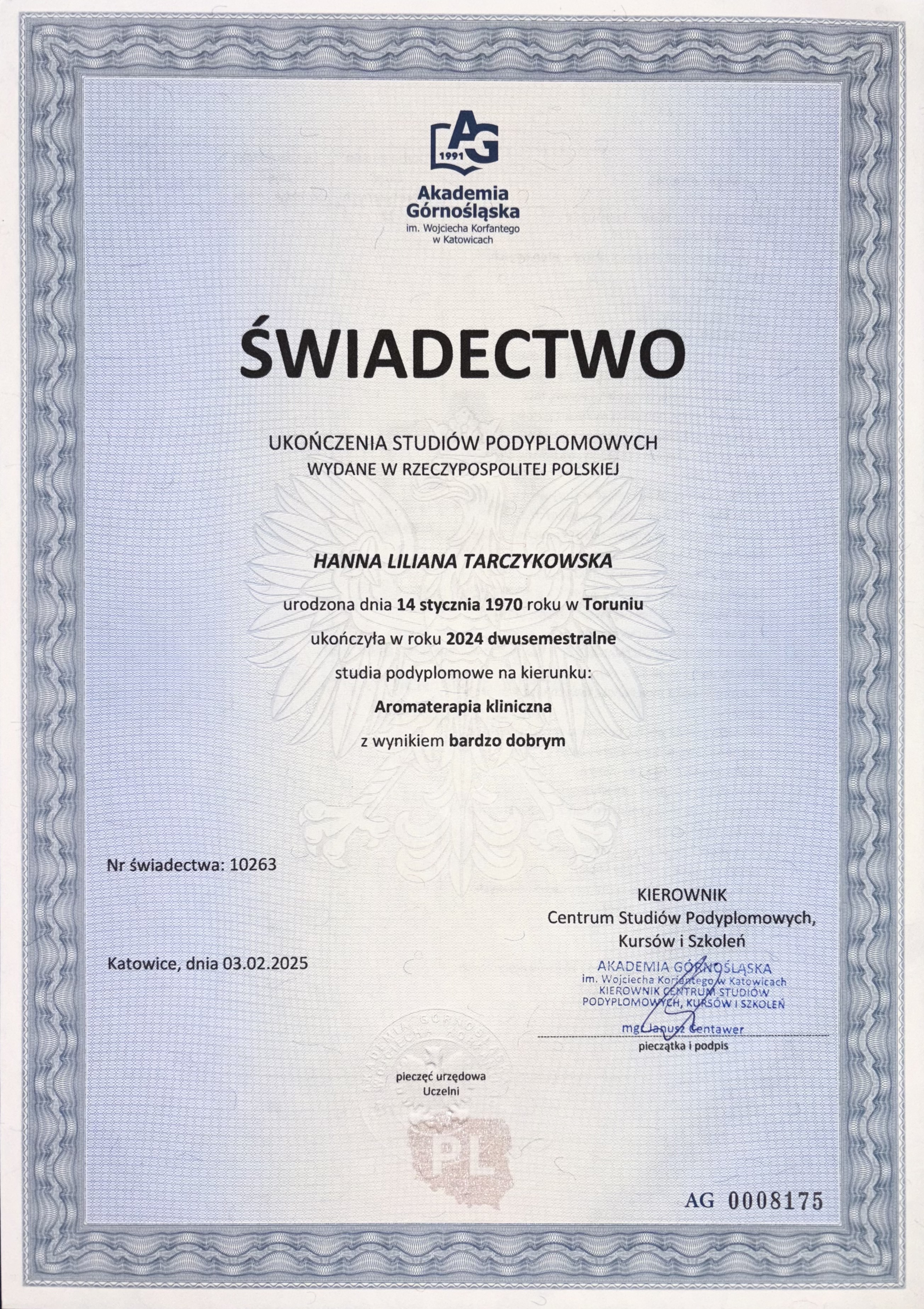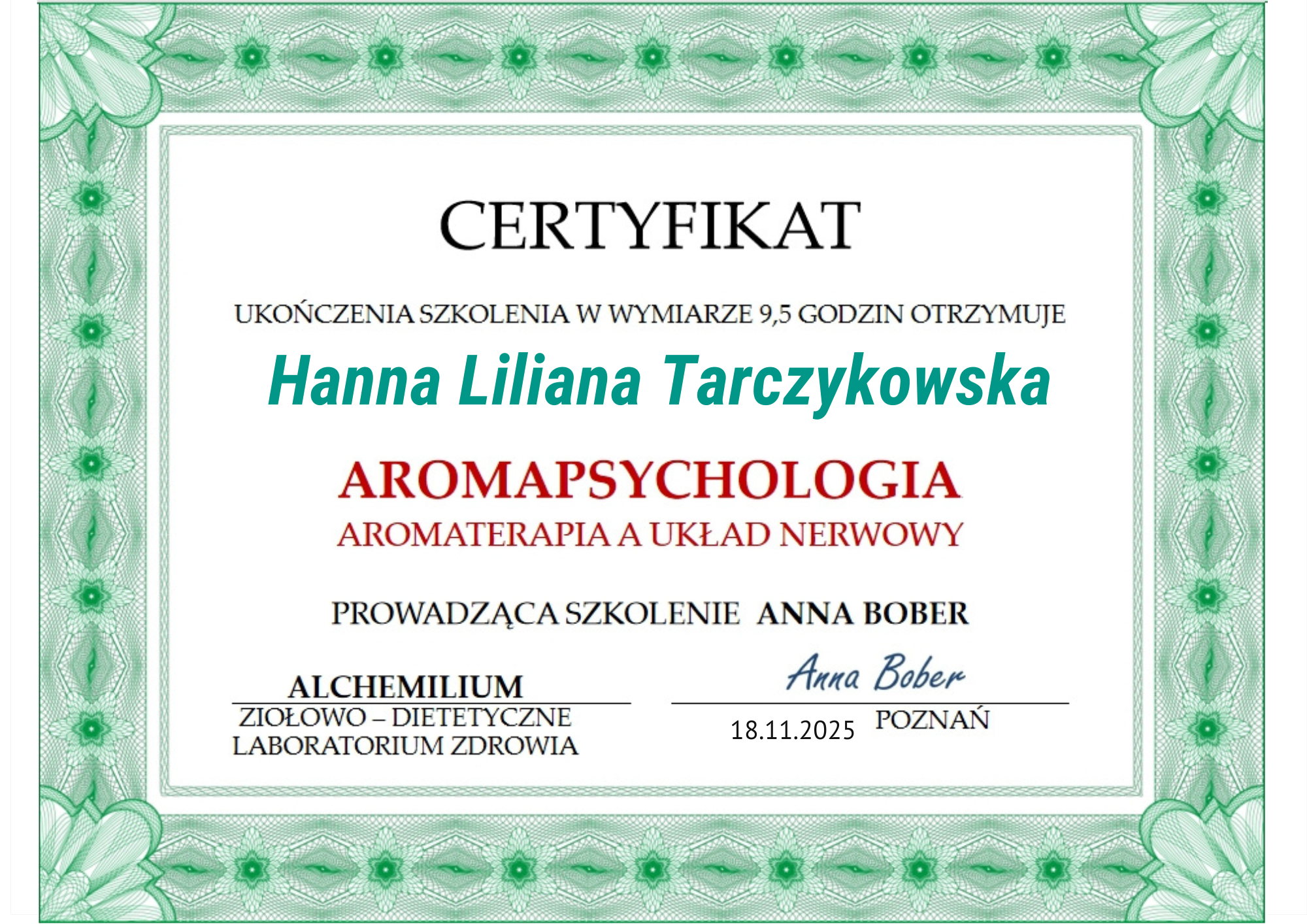 Ukończyłam w 2024 roku pierwsze w Polsce studia podyplomowe z Aromaterapii na Akademii Górnośląskiej w Katowicach i uzyskałam tytuł Aromaterapeuty. Nie jestem producentem olejków, ale Źródło Natury doprowadziło mnie do producenta, który je produkuje w najwyższej jakości i czystości, spełniając wszystkie rygorystyczne wymogi upraw i produkcji. To samo Źródło Natury prowadzi mnie, kiedy podczas medytacji napełniam buteleczki olejkami z intencją dla każdego inną, aby moc tych olejków, dopełniona kroplą Miłości Źródła Natury pięknie służyła każdemu, kto będzie z nich korzystał.