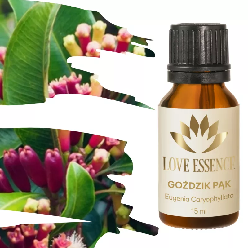 Olejek eteryczny z pąków goździka ma słodki, drzewny, korzenny aromat z balsamiczno - owocową nutą, którą nadaje olejkowi główna substancja czynna eugenol - naturalny środek znieczulający i odkażający. Jest najpopularniejszym olejkiem do łagodzenia bólu całego ciała.